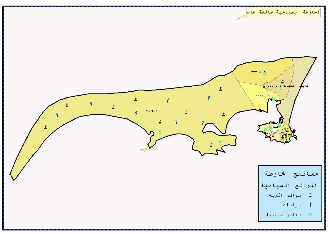 الموقع : تقع محافظة عدن على ساحل خليج عدن، بين دائرتي عرض (47- 12) شمال خط الاستواء . وتبعد عن العاصمة صنعاء بمسافة تصل إلى حوالي (363) كيلو متراً. المساحة : تبلغ مساحة المحافظة حوالي (750 )كيلومتر مربع تتوزع على ثمان مديريات وذلك بحسب التقسيم الإداري لعام 2004م . تتعدد في المحافظة المعالم السياحية الكثيرة والمتنوعة والشواطئ السياحية الجميلة والجذابة . 1- المتنفسات السياحية الطبيعية :